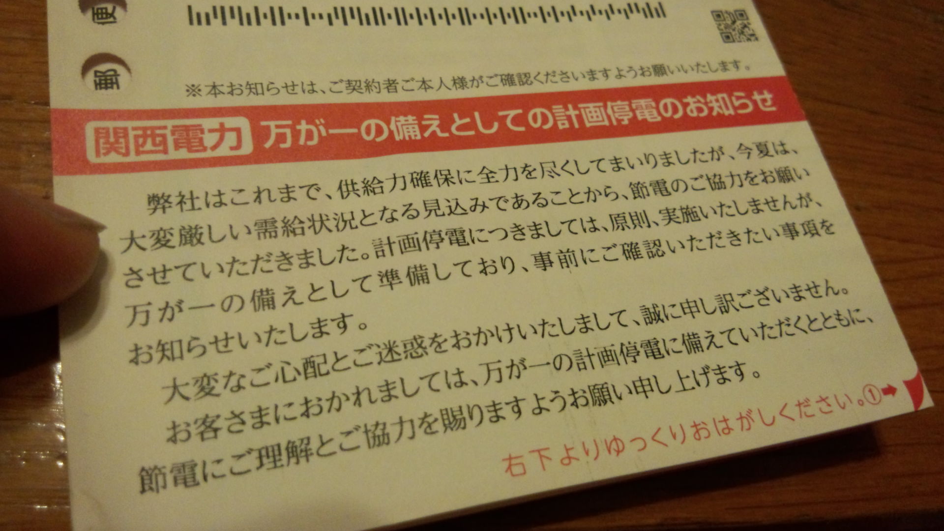 今日家に帰ったら、このような手紙が・・・ ん?計画停電?? そんな話、聞いてないよ~